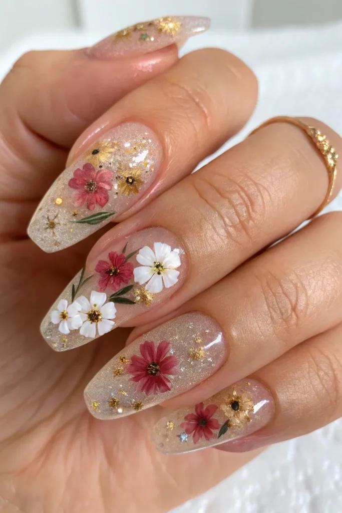 Tiny dried flowers and sparkles encased in clear gel nails give a dreamy, romantic effect. The mix of clear and soft hues feels like a mini art piece on every nail.
