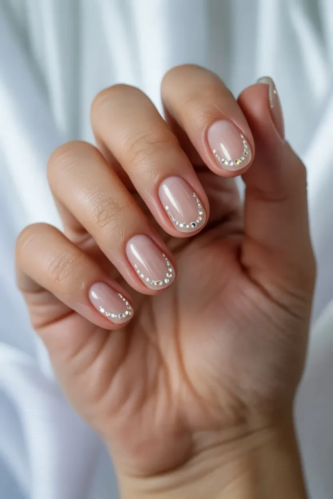 This design features rhinestones placed strategically along the edges or cuticles of the nails. It creates a sophisticated, high-fashion aesthetic without overpowering the clear base.