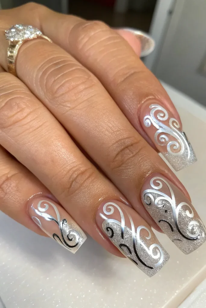 5. Clear Nails with Silver Chrome Swirls