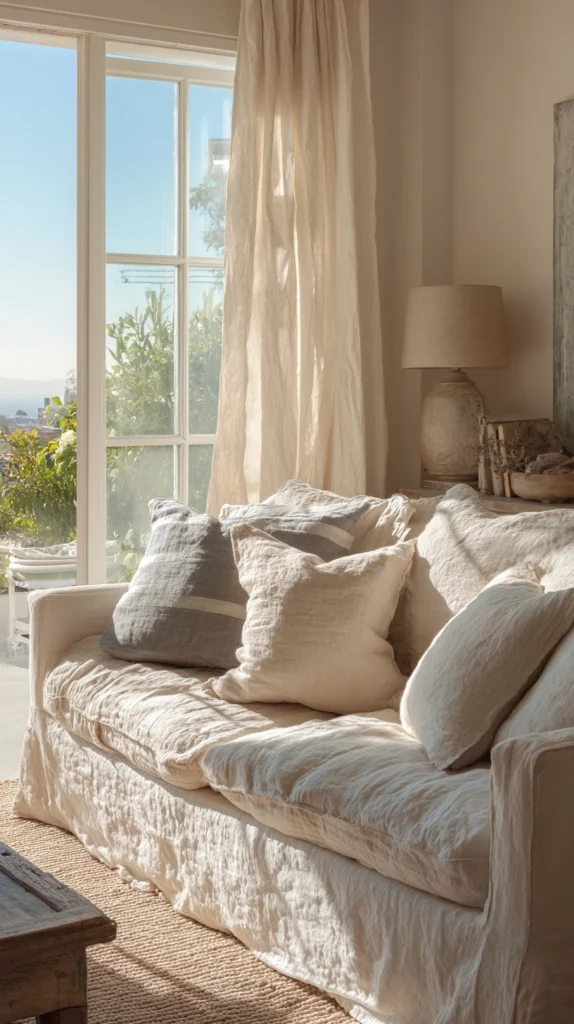 Stone-washed linen duvet covers cost $80–$180 for a quality set. Linen sofa throw covers run $60–$150. Linen cushion covers in natural, oatmeal, or pale grey tones cost $15–$35 each. Source from independent textile makers and smaller linen brands where the stone-washing process is done properly rather than simulated — the difference between genuine stone-washed linen and fabric that has simply been pre-wrinkled at the factory is immediately apparent in feel and in the way the material moves and drapes. The investment in real linen is repaid across many summers rather than a single season.