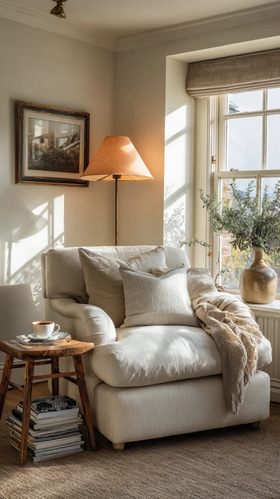 A good armchair — comfortable enough to sit in for two hours without discomfort — costs $150–$400 new or $40–$150 second-hand in good condition. A simple wooden side table runs $30–$80. A reading lamp with a warm bulb costs $30–$80. A linen or cotton slipcover for the chair in a neutral tone costs $60–$150 if the chair’s original upholstery is not quite right. The total investment in a genuinely functional reading corner sits between $200 and $500 for a new setup — less if second-hand furniture and existing lamps are incorporated into the arrangement.