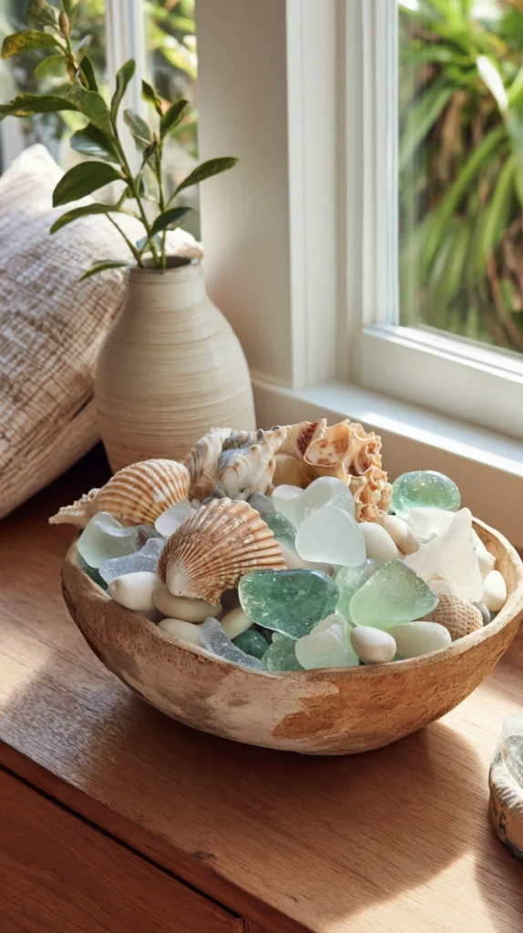 Gathered shells and sea glass cost nothing beyond the walks that produced them. A shallow ceramic bowl for display costs $10–$25 from a pottery or homeware retailer. A large glass apothecary jar or a wide-mouth glass vase costs $8–$20. If your shell collection is thin, supplementing with a small bag of natural, unbleached shells from a craft supplier costs $5–$15. Arrange the collection without overthinking the placement — the organic, unstudied quality of shells tipped gently into a bowl is more in keeping with the aesthetic than any carefully posed arrangement would be.