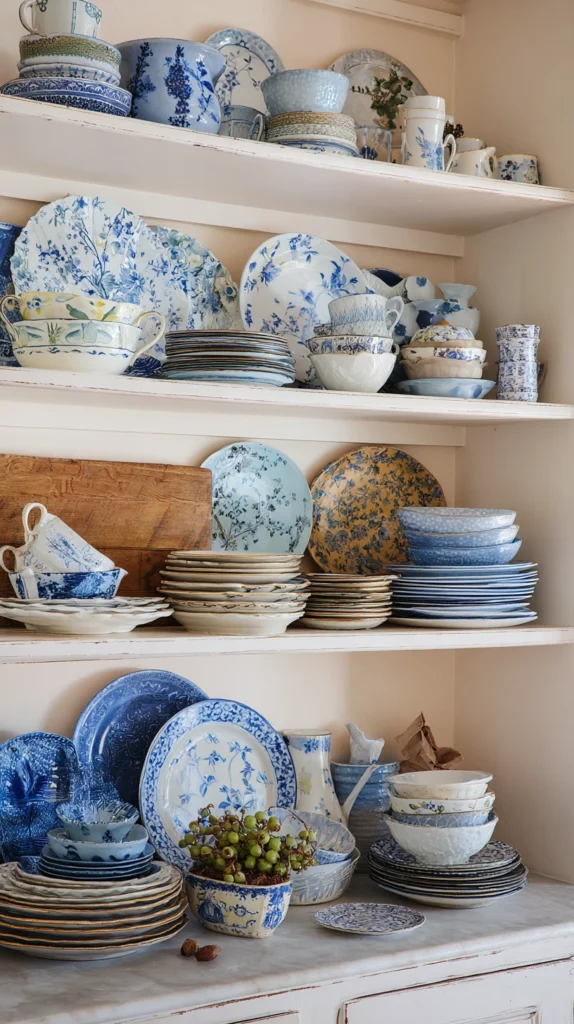 A collection of blue and white china — plates, jugs, serving bowls, and teacups in various patterns that complement rather than match each other — displayed on open kitchen shelving, a Welsh dresser, or along a plate rail is one of the most enduring and most specifically coastal grandmother decor signatures. The blue and white palette references the sea without requiring any further nautical elaboration. The mix of patterns reflects a collection assembled over time from different sources. The display signals that beautiful things are used and seen rather than stored and preserved.