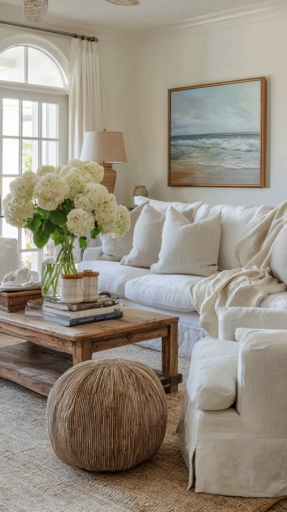 An oversized linen or cotton throw draped loosely over the back and arm of a sofa or armchair is one of the simplest and most effective coastal grandmother decor moves available. It adds texture, warmth, and the suggestion of comfortable habitation — of a person who might pick it up and wrap themselves in it at any moment — in a way that a cushion arrangement or a styled surface cannot. It also covers upholstery that is not quite right for the aesthetic, which makes it one of the most practical as well as most atmospheric additions to a coastal summer interior.