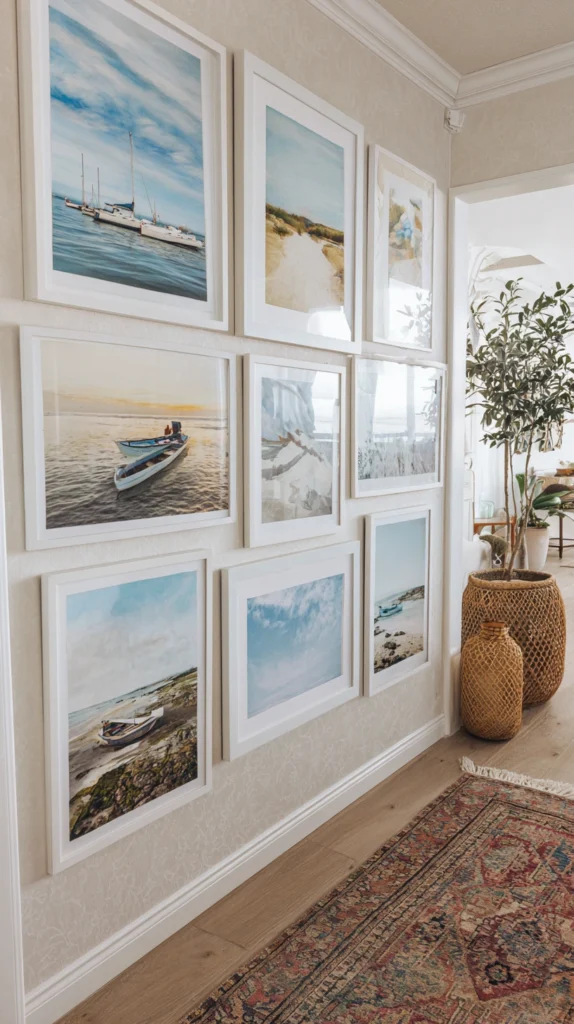 Original watercolour prints from independent artists on Etsy and at craft markets cost $15–$60 for a small to medium piece. A set of three related prints — a harbour, a seabird, and a coastal botanical — framed simply in white or natural wood frames ($10–$25 each) creates a wall arrangement for $60–$150 in total. Look for prints with a restrained palette — blues, greens, sandy neutrals, and white — rather than brightly coloured seascape illustrations that suit a different, more cheerful coastal style. The watercolour coastal grandmother palette is always quiet rather than vivid.