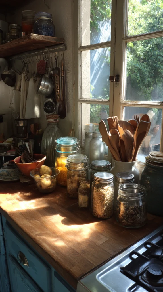 A stoneware utensil holder costs $15–$35. A simple ceramic fruit bowl costs $20–$50. A bunch of fresh herbs in a glass jar costs nothing from the garden and $3–$5 from a market. A handwritten recipe card displayed in a small wooden frame costs the price of the frame — $5–$15. The combined effect of these objects in a working kitchen costs under $100 and creates the kitchen character that no amount of purchased decor can substitute for. The coastal grandmother kitchen is staged by cooking in it, not by styling it.