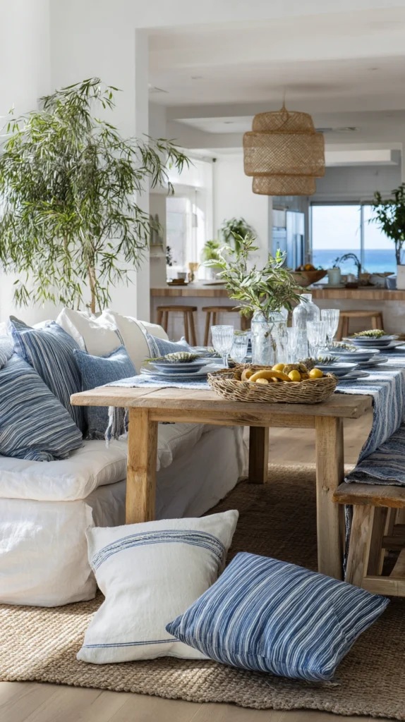 A quality linen or cotton-linen throw in a generous size — 130×180 cm or larger — costs $30–$80 from textile and homewares retailers. Vintage blankets and throws from charity shops cost $5–$20 and often have exactly the right faded, softened quality that new throws take years to develop. Striped cotton throws in navy and white or sand and cream run $25–$60 and suit the coastal palette particularly well. Drape the throw with deliberate casualness — pulled to one side, slightly rumpled, as if it has just been set down — rather than folded precisely over the sofa back where it looks more like a store display than something that belongs to anyone.