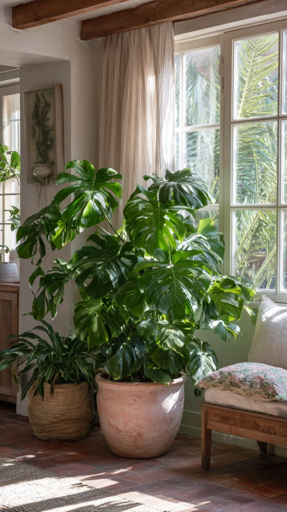 A medium monstera deliciosa in a 17–19 cm pot costs $20–$40. A large pothos in a hanging pot costs $12–$25. A fiddle leaf fig in a 21 cm pot runs $25–$60. Simple white or terracotta ceramic pots cost $8–$25 depending on size. The plants are placed where they will genuinely thrive — near natural light, away from heating and air conditioning vents — rather than where they look best for a photograph. A plant that is doing well looks better than a healthy plant placed in the wrong position for the sake of a styled corner, which is a distinction the coastal grandmother intuitively understands.