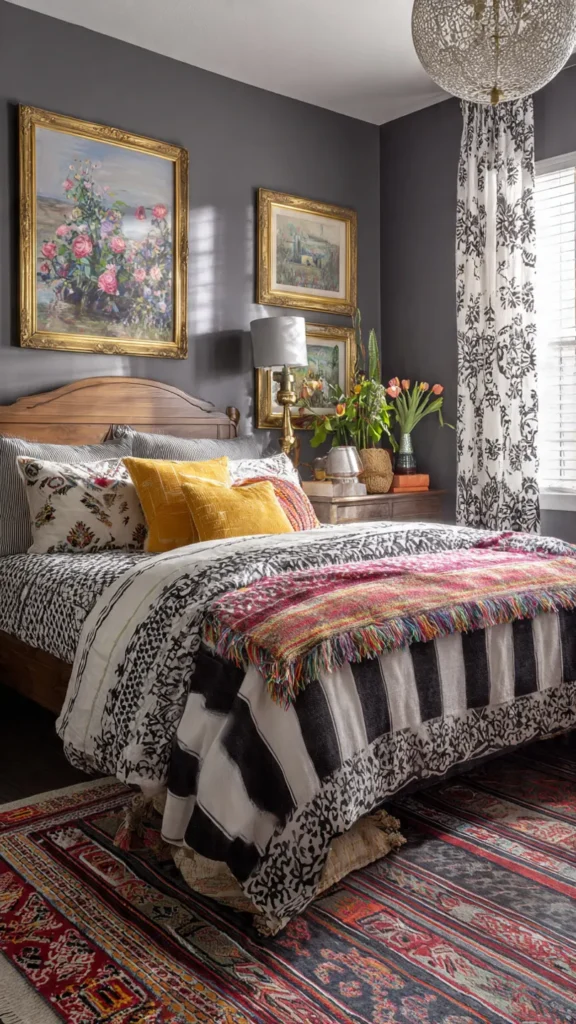 A layered pattern eclectic bedroom thrives on visual richness. Multiple patterns appear across bedding, rugs, cushions, and wall decor, creating a dynamic space that feels energetic and expressive. The beauty of this style lies in its fearless mixing, where florals, stripes, and abstract designs coexist without strict coordination.