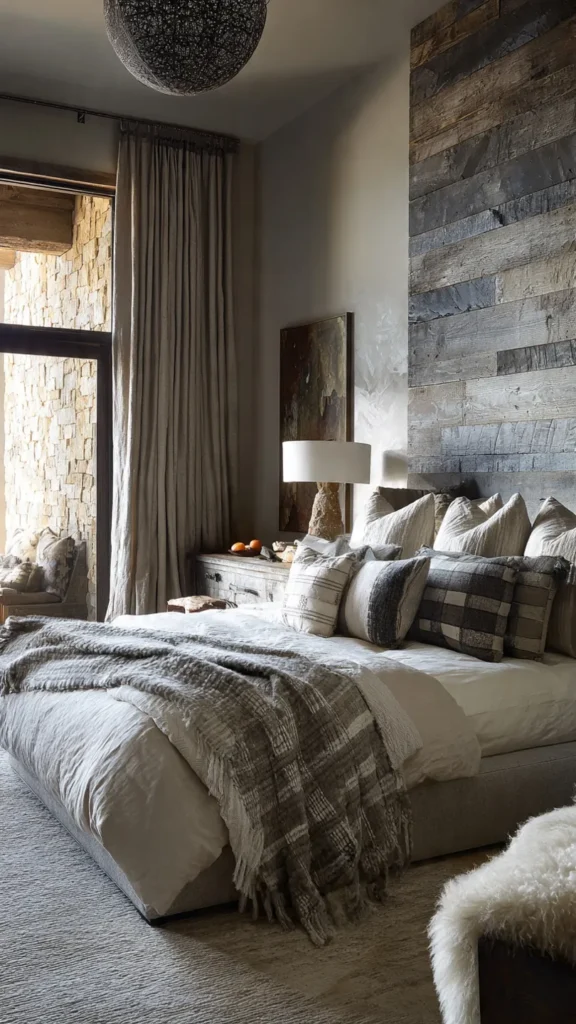 This eclectic bedroom idea focuses on texture as a primary design element. Smooth surfaces contrast with rough finishes, while soft fabrics balance structured materials.