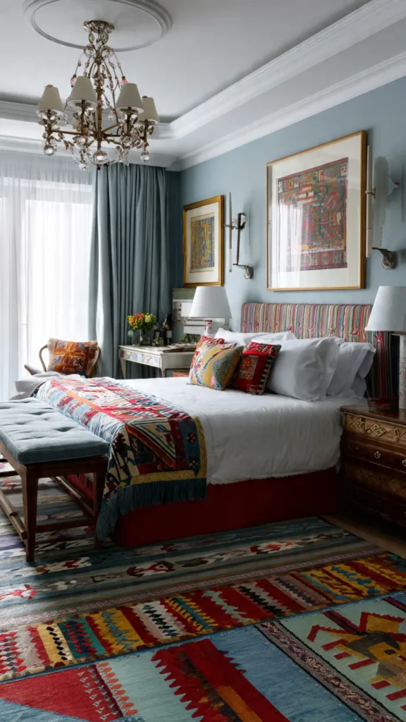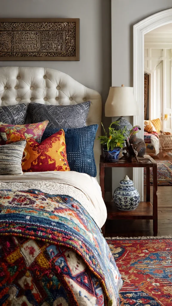 Layering is key to this style. Mixing textures and decorative elements from different regions creates warmth and authenticity, making the bedroom feel collected over time rather than designed all at once.