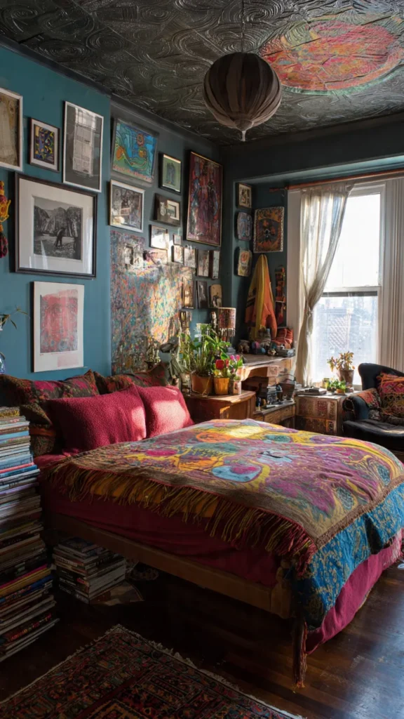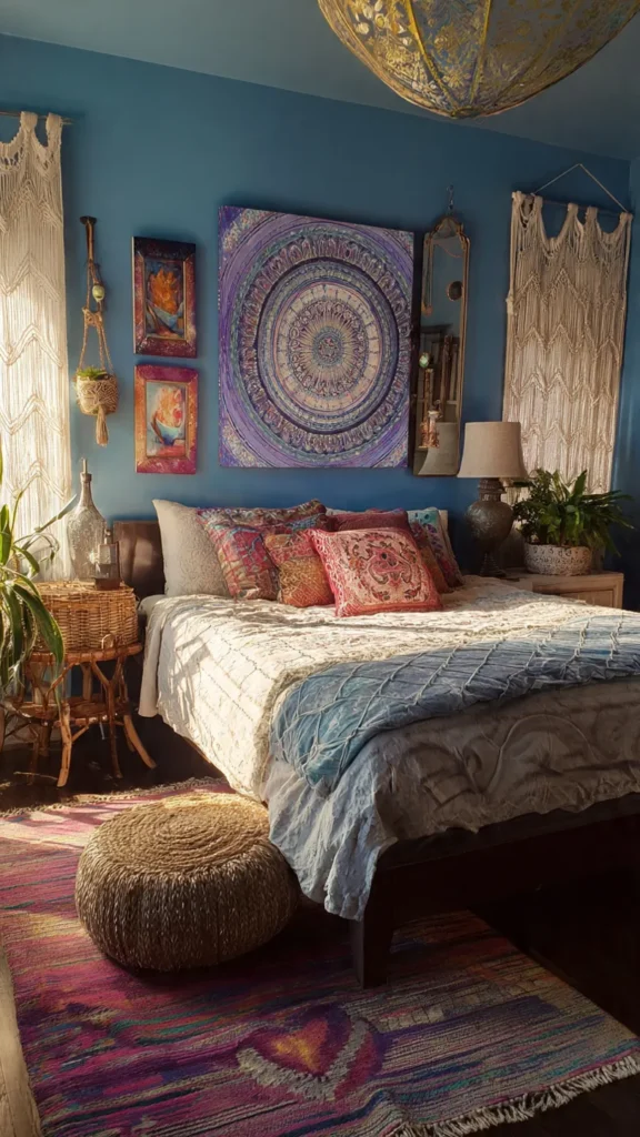 Artistic bohemian eclectic bedrooms blend creativity with comfort. Layered fabrics, expressive wall art, and handcrafted decor create a relaxed environment that feels both soulful and visually rich.