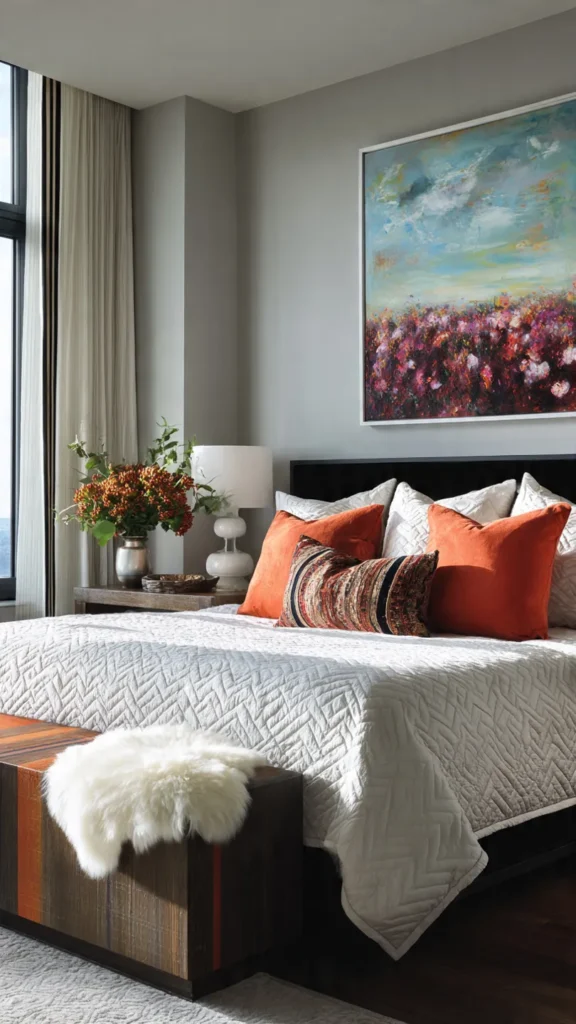 Contemporary eclectic bedrooms combine modern structure with expressive details. Clean-lined furniture forms the foundation, while bold textiles and artwork introduce vibrancy.