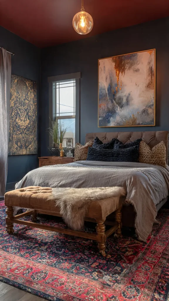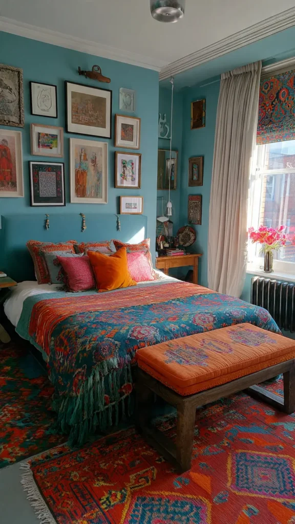 A bold accent wall anchors this eclectic bedroom style. Whether achieved through paint, wallpaper, or an artistic mural, the wall sets the emotional tone of the space and draws immediate attention.
