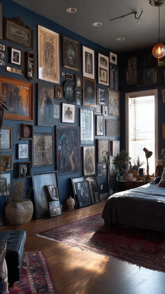 An art-lover’s eclectic bedroom treats art as the heart of the design. Walls become a curated gallery of paintings, prints, sketches, and handmade pieces that reflect taste, mood, and personal history. Each artwork adds emotional depth, turning the room into a living story.