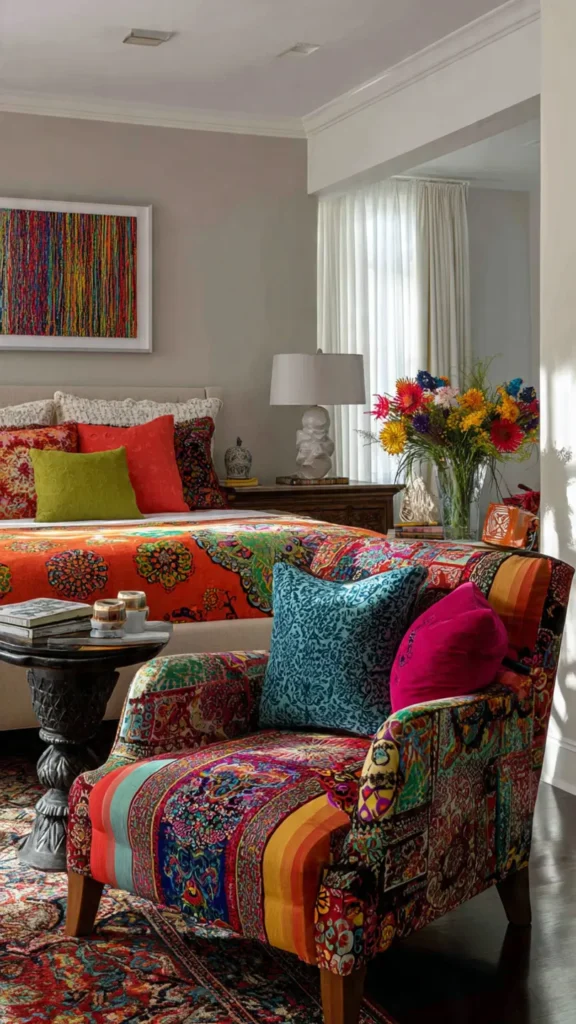 Despite the visual intensity, structure is essential. When repetition and rhythm guide placement, the room feels joyful and expressive rather than overwhelming, offering a vibrant yet livable atmosphere.