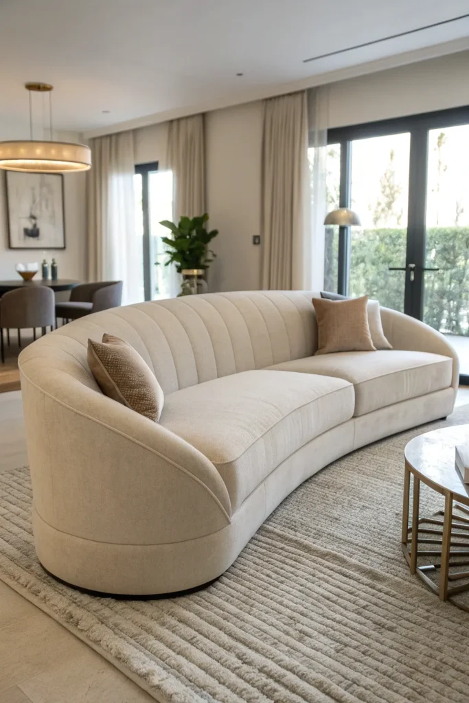 Upholster the continuous built-in seating in a single fabric to emphasize the flowing form, and position a round coffee table or fire feature at the center to anchor the space and provide a natural focal point.