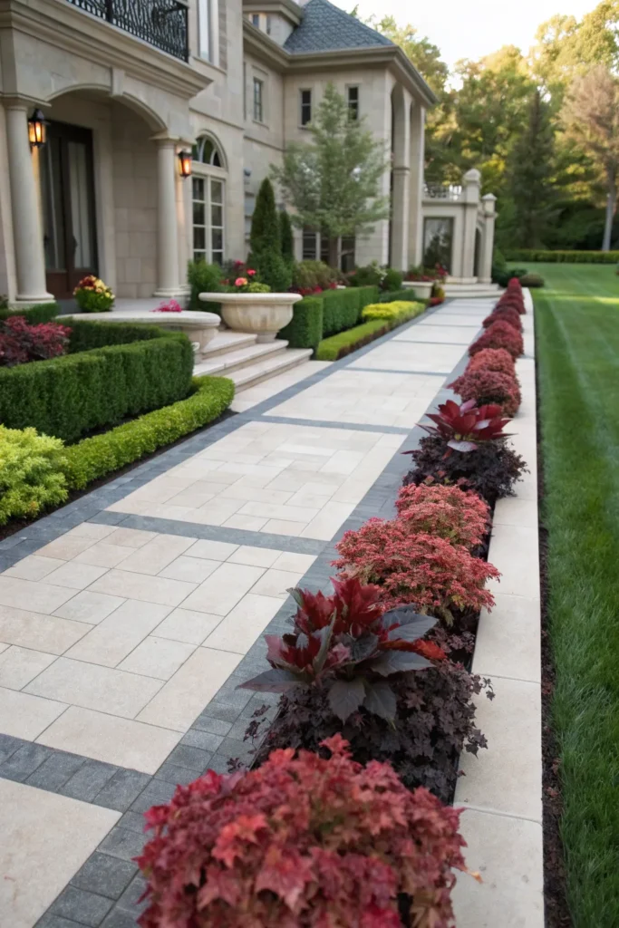Frame your walkway with coral bells in varying shades of burgundy, lime, and deep purple. Their low height and full shape create a sleek and tidy border that complements concrete, stone, or paver paths.