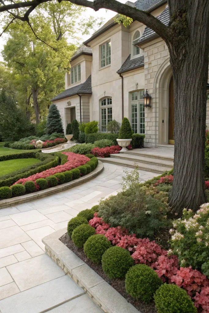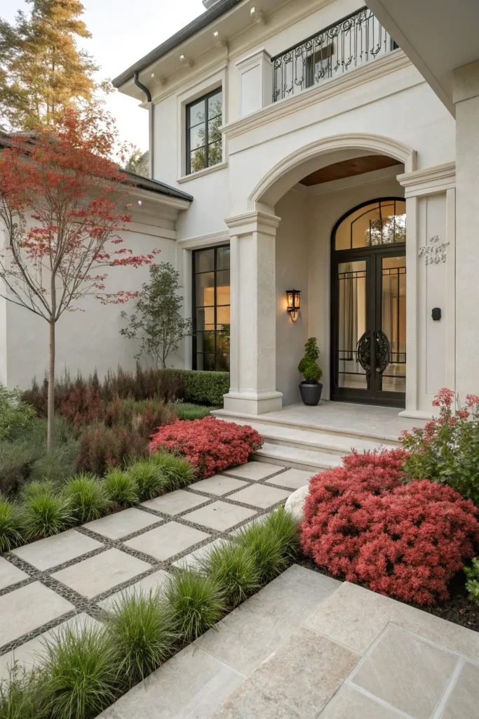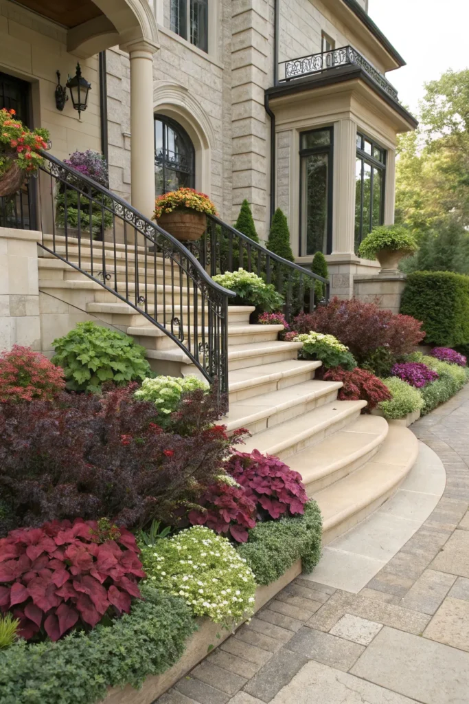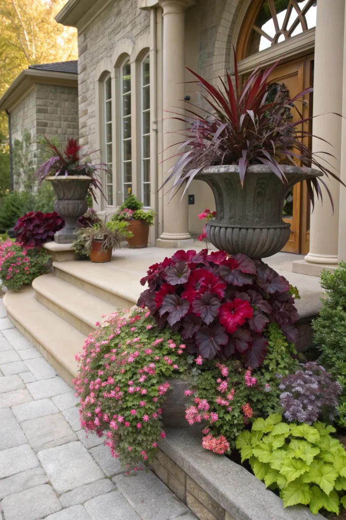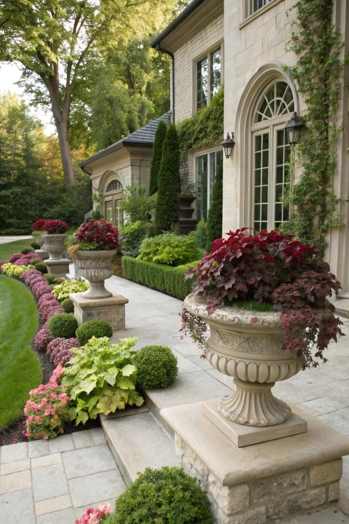 Use large, modern planters on both sides of your front door filled with coral bells and trailing ivy. This creates a symmetrical, sophisticated look that softens hardscapes.