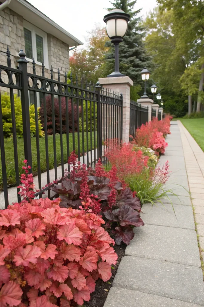 Add a soft, colorful touch to your front fence or wall by planting coral bells at its base.