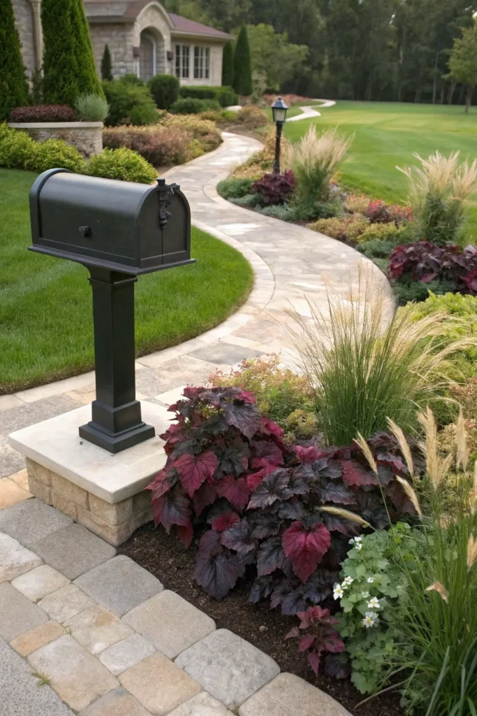Turn your mailbox area into a mini garden with coral bells, miniature boxwoods, and seasonal blooms. The vibrant foliage adds instant charm.