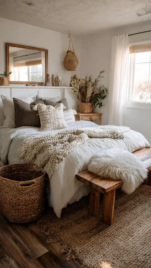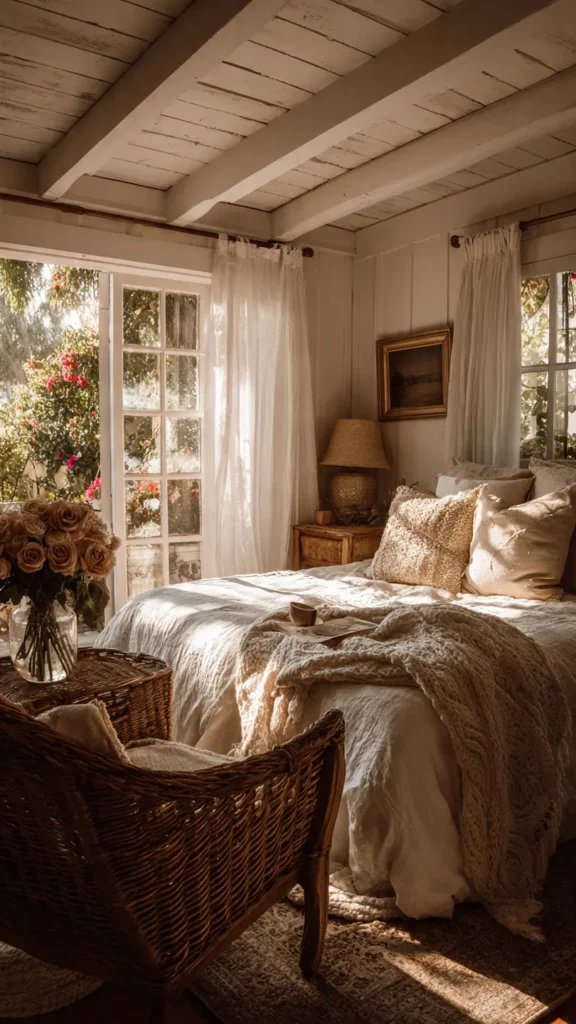 Country living is all about staying connected to nature. Incorporate natural materials such as wood, wicker, rattan, linen, and wool throughout the bedroom. A woven basket, a jute rug, or a wooden stool adds texture and warmth. These elements balance softer fabrics and help ground the space in rustic simplicity.