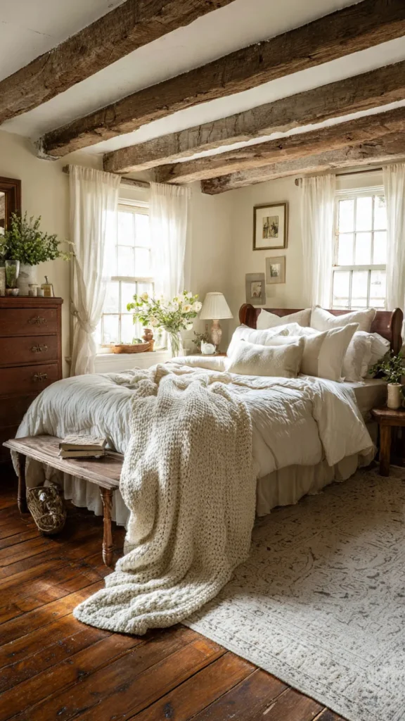 Furniture plays a key role in capturing the charm of country living. Look for pieces with a vintage or antique feel, such as a wooden bed frame with carved details, a distressed dresser, or a painted nightstand. Imperfections like chipped paint or worn edges add character and tell a story, making the bedroom feel lived-in and loved.
