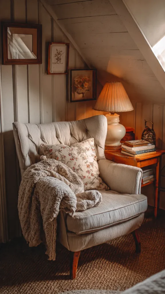 If space allows, add a small reading nook with a comfy chair, a soft cushion, and a throw blanket. A simple side table and a lamp complete the setup. This cozy corner encourages quiet moments of rest, reading, or journaling, perfectly aligning with the cottagecore philosophy of slow living.