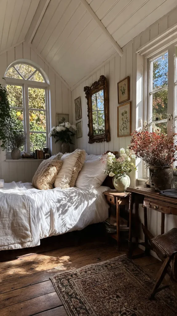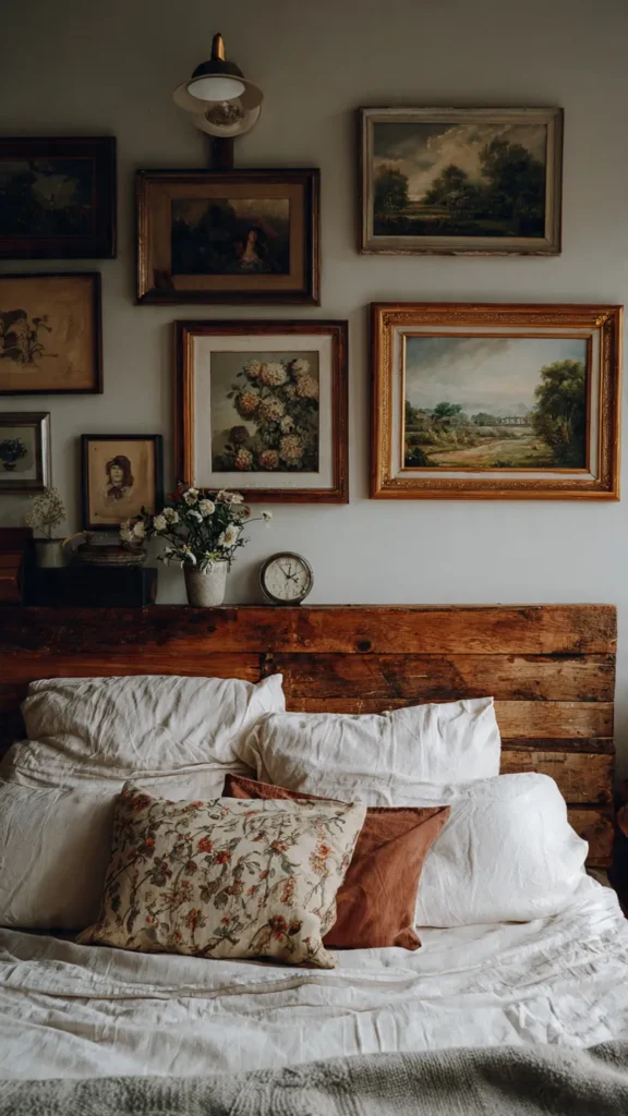 Wall art in a cottagecore bedroom should feel gentle and nostalgic. Botanical illustrations, countryside landscapes, or vintage portraits work beautifully. Wooden or distressed frames add to the rustic charm and help the artwork blend seamlessly into the overall design.