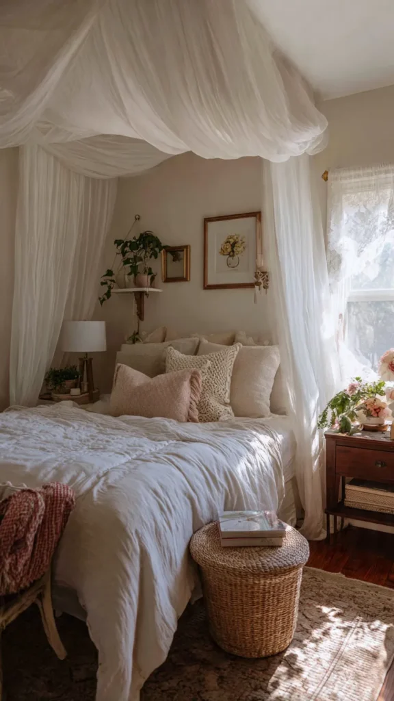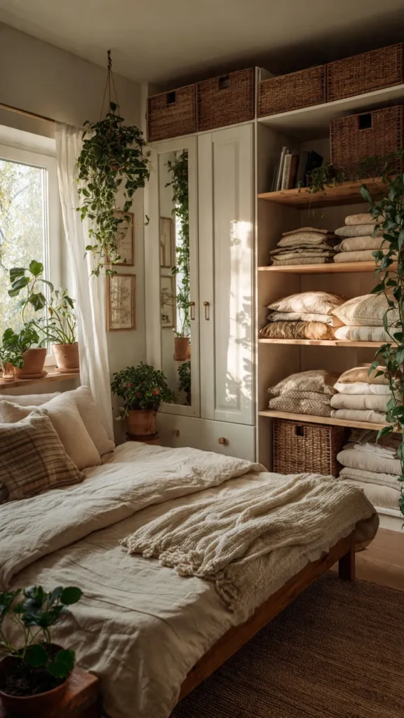A cottagecore bedroom should feel peaceful, not cluttered. Use storage solutions that blend into the decor, such as wicker baskets, wooden chests, or fabric-lined drawers. Keeping belongings neatly tucked away maintains a calm atmosphere while preserving the cozy, collected look.