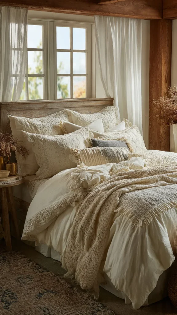 Comfort is essential in a cottagecore bedroom. Layer your bed with breathable cotton or linen sheets, a quilt or patchwork coverlet, and a light throw at the foot of the bed. Ruffled edges, lace trims, or crochet details enhance the cozy, handmade feel. This layered approach not only looks inviting but also adds warmth and texture.