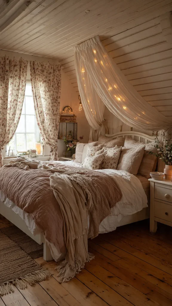 Lighting should be gentle and atmospheric. Choose table lamps with fabric or pleated shades, wall sconces, or fairy lights to create a warm glow. Soft lighting enhances the calm, romantic mood of a cottagecore bedroom and makes it a relaxing place to unwind at the end of the day.