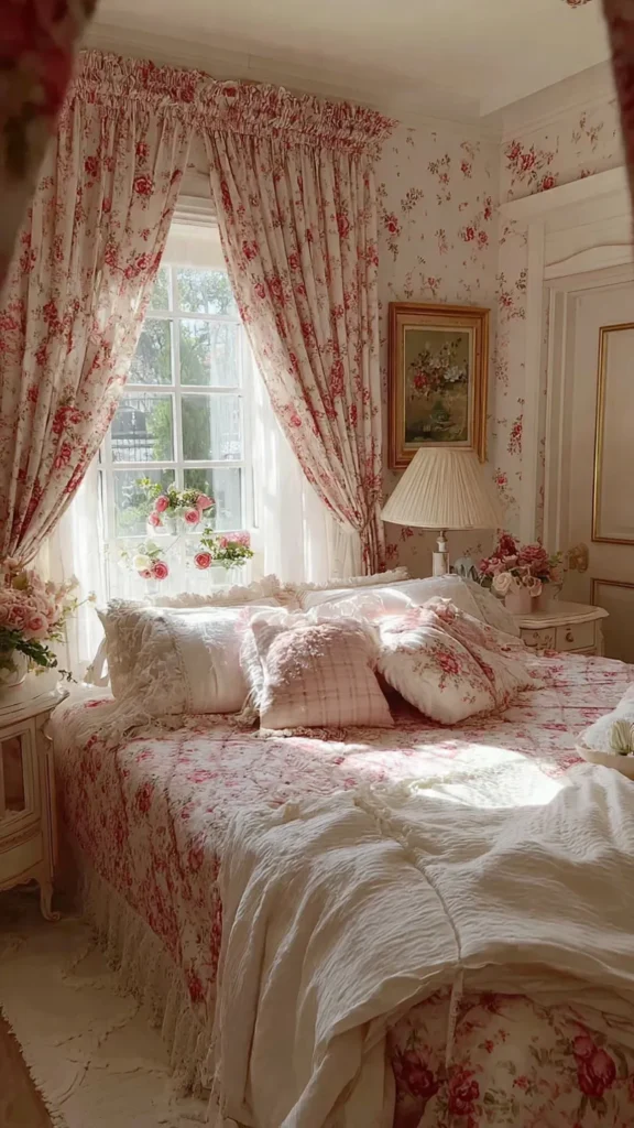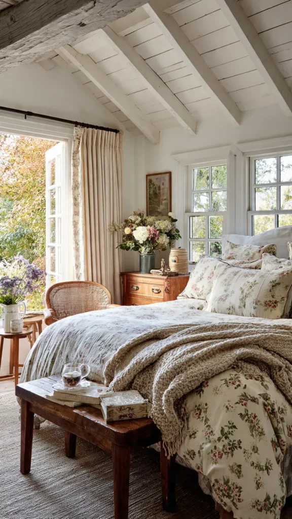 Window treatments can dramatically influence the feel of the room. Floral, gingham, or lightly patterned curtains add a classic country touch while softening natural light. Lightweight fabrics allow sunlight to filter through gently, making the bedroom feel bright yet cozy.