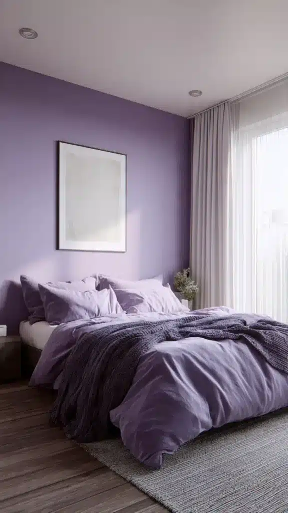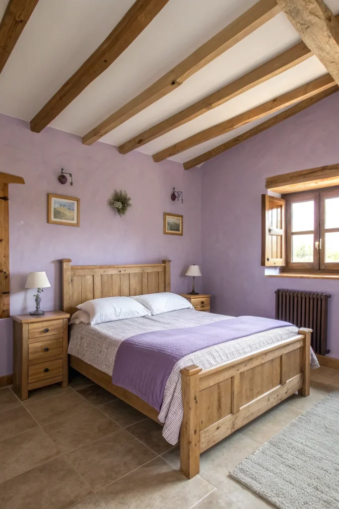 Lavender is one of the gentlest purple shades and works beautifully as a wall color in a cozy bedroom. When paired with natural wood furniture such as oak bed frames, bedside tables, or exposed ceiling beams, the room instantly feels warmer and more inviting. The wood adds an organic element that softens the purple and keeps the space from feeling too cool or artificial. Linen bedding, woven rugs, and simple ceramic decor help complete the earthy look.