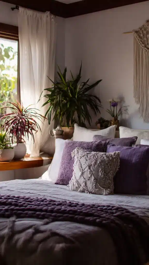 Plants add life and freshness to any bedroom, and they pair especially well with earthy purple tones. Choose greenery with deep green leaves or subtle purple undertones to complement the room. Terracotta pots, woven baskets, or clay planters reinforce the earthy aesthetic and create a natural connection within the space.