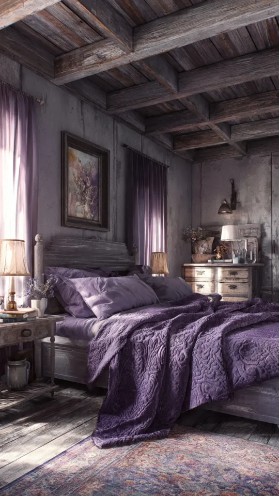 A rustic bedroom style benefits greatly from earthy purple shades. Think faded purple quilts, distressed wooden furniture, and vintage-inspired decor pieces. This combination feels collected and personal rather than overly styled. Soft purple tones help bring warmth to rustic spaces while maintaining a sense of history and charm.