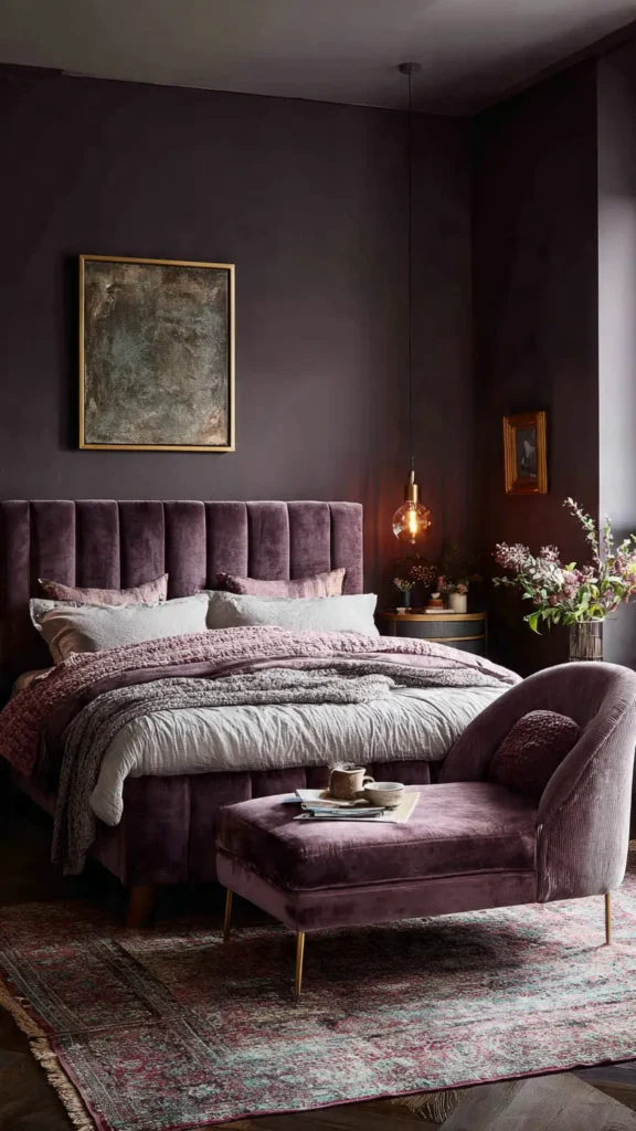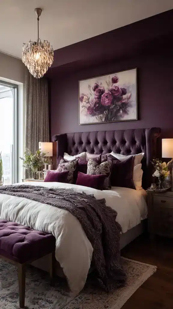 A deep plum feature wall can anchor the bedroom and create a sense of enclosure that feels comforting rather than heavy. This shade works especially well behind the bed, acting as a natural focal point. Balance the richness of plum with lighter neutral bedding, raw wood nightstands, and matte black or bronze hardware. The contrast creates depth while maintaining a grounded, cozy atmosphere.