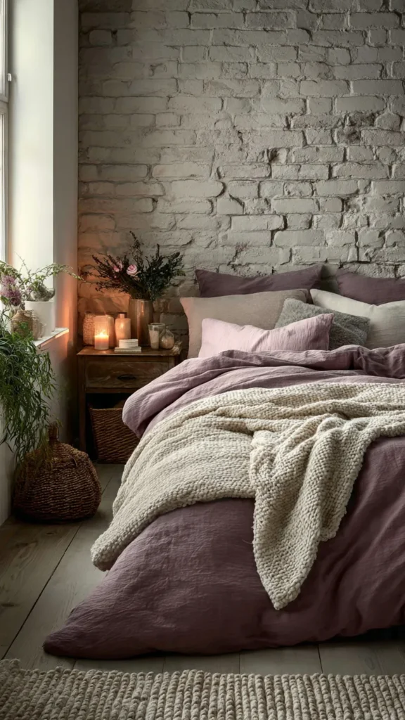 If you prefer neutral walls, muted mauve bedding is an excellent way to introduce earthy purple into your bedroom. Mauve has soft brown undertones that blend effortlessly with natural textures. Layer a mauve duvet with cream sheets, chunky knit throws, and textured cushions. This approach keeps the room calm while still adding color and personality.