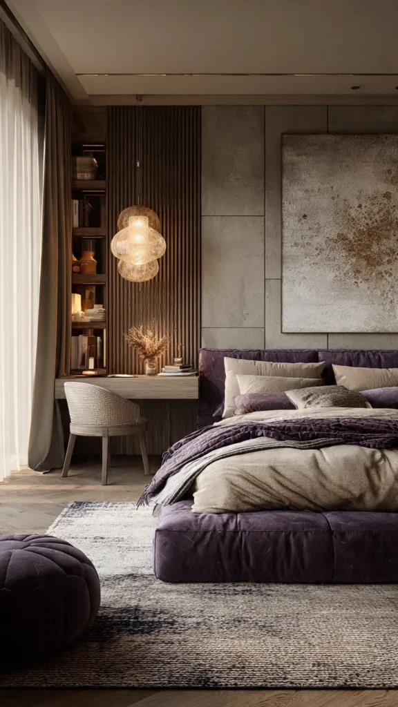Introducing earthy purple through furniture is a subtle yet impactful choice. Consider an upholstered bed frame, a velvet bench at the foot of the bed, or a cozy reading chair in a muted purple tone. These pieces add warmth and character while allowing the rest of the room to remain neutral and grounded with wood, jute, or stone-inspired textures.