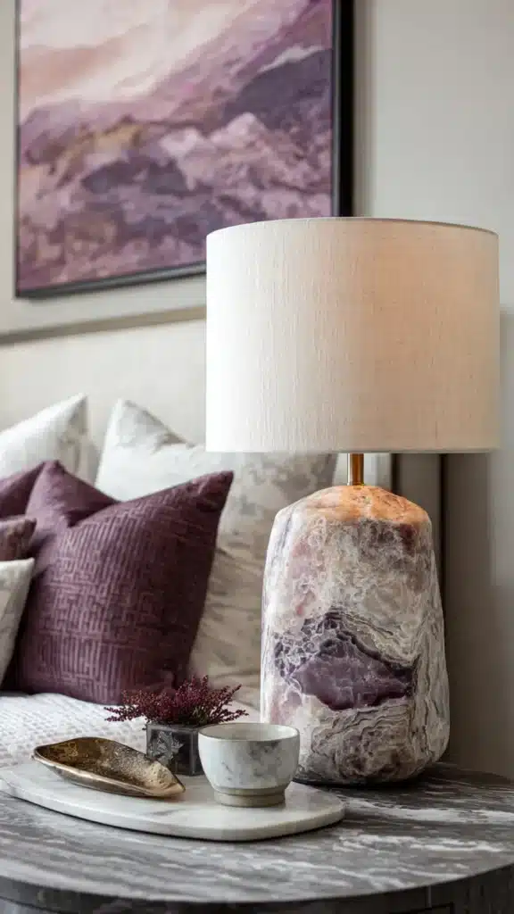 Natural stone elements such as marble, slate, or travertine pair surprisingly well with earthy purple shades. A stone bedside lamp, a marble tray, or even stone-inspired wall art can elevate the bedroom while keeping it grounded. The cool texture of stone contrasts beautifully with the warmth of purple, resulting in a calm and balanced space.