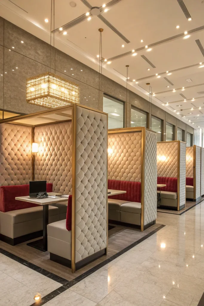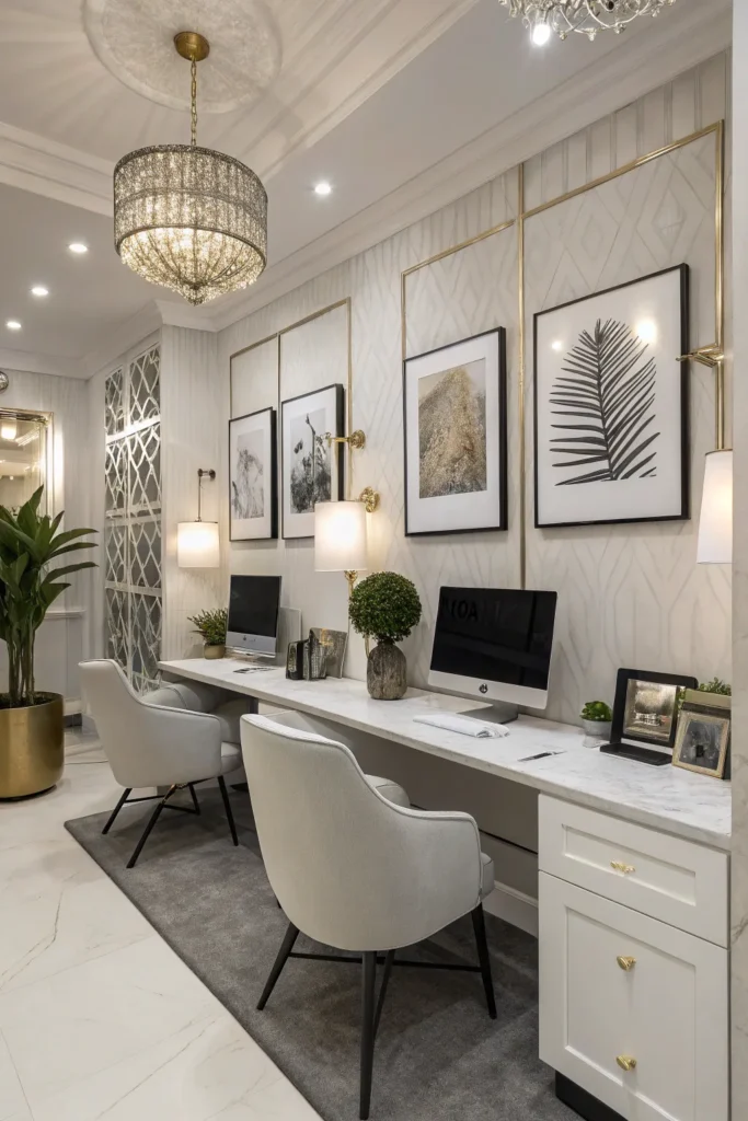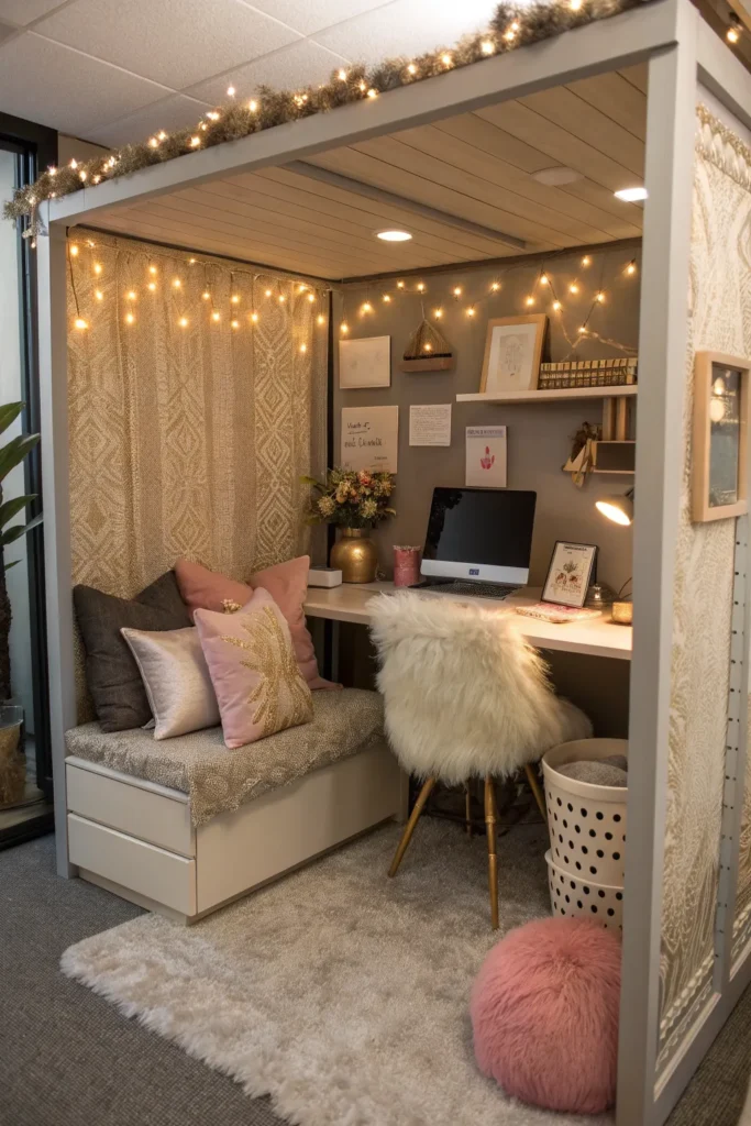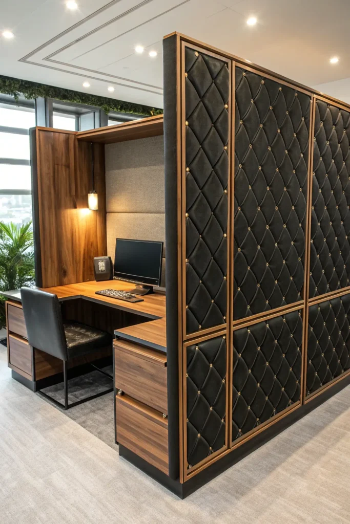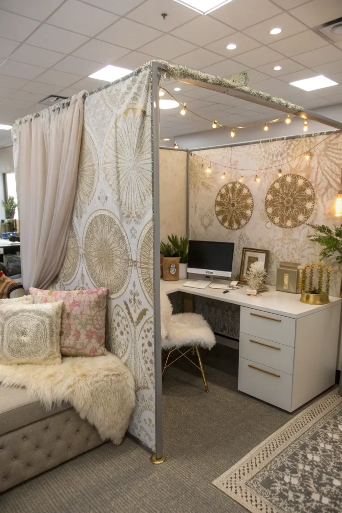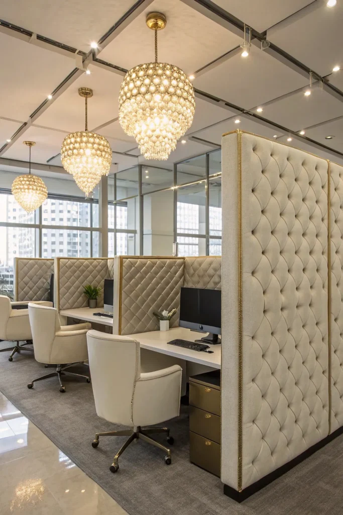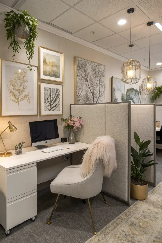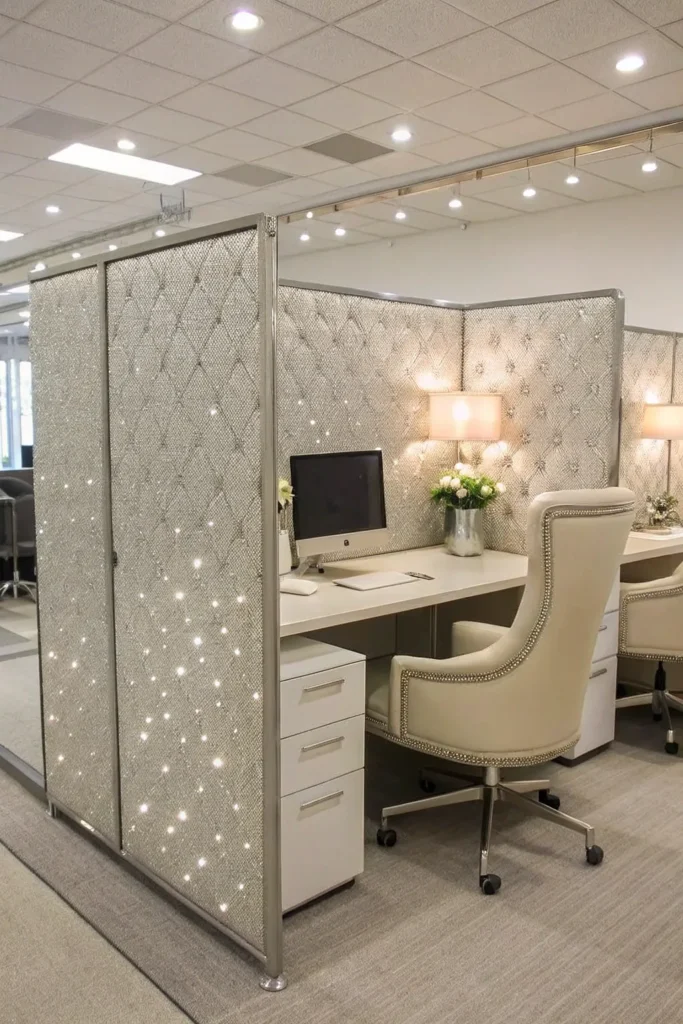 Turn your cubicle into a stylish personal suite with subtle luxury. It’s elegant, sophisticated, and still work-friendly — think soft lighting, metallic accents, and tactile textures.