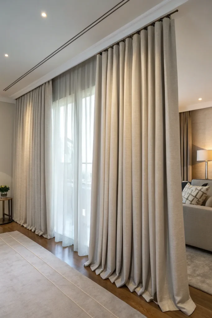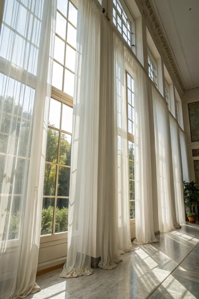 Layering sheer panels with solid curtains—both hung high—adds depth without sacrificing height. This combination works beautifully in bedrooms and living rooms.