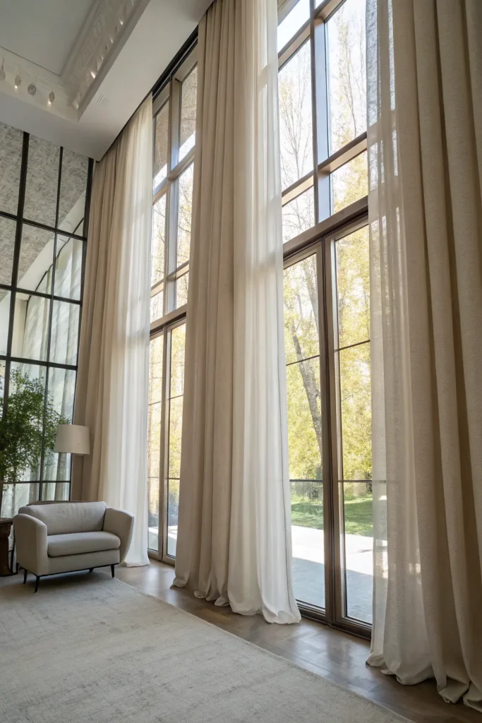 Flowing fabrics move gently and emphasize vertical lines, enhancing the feeling of height. In modern spaces, these materials also add texture without feeling heavy or traditional.