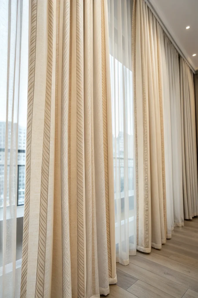 Light-colored curtains reflect more light, making walls feel brighter and more open. This brightness naturally enhances the sense of height.