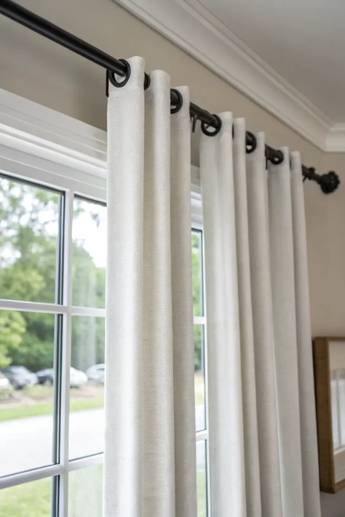Oversized or ornate curtain rods can visually lower the ceiling by drawing attention to the hardware. Slim, minimal rods keep the focus on the curtains themselves and maintain a streamlined look.