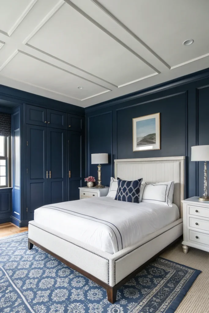 A dark blue and white bedroom feels crisp, fresh, and timeless. Use dark blue on walls or large furniture pieces, and balance it with white bedding, trim, and ceilings. This contrast keeps the room feeling bright while still benefiting from the richness of dark blue. It’s a great option for modern homes that value simplicity and clarity.