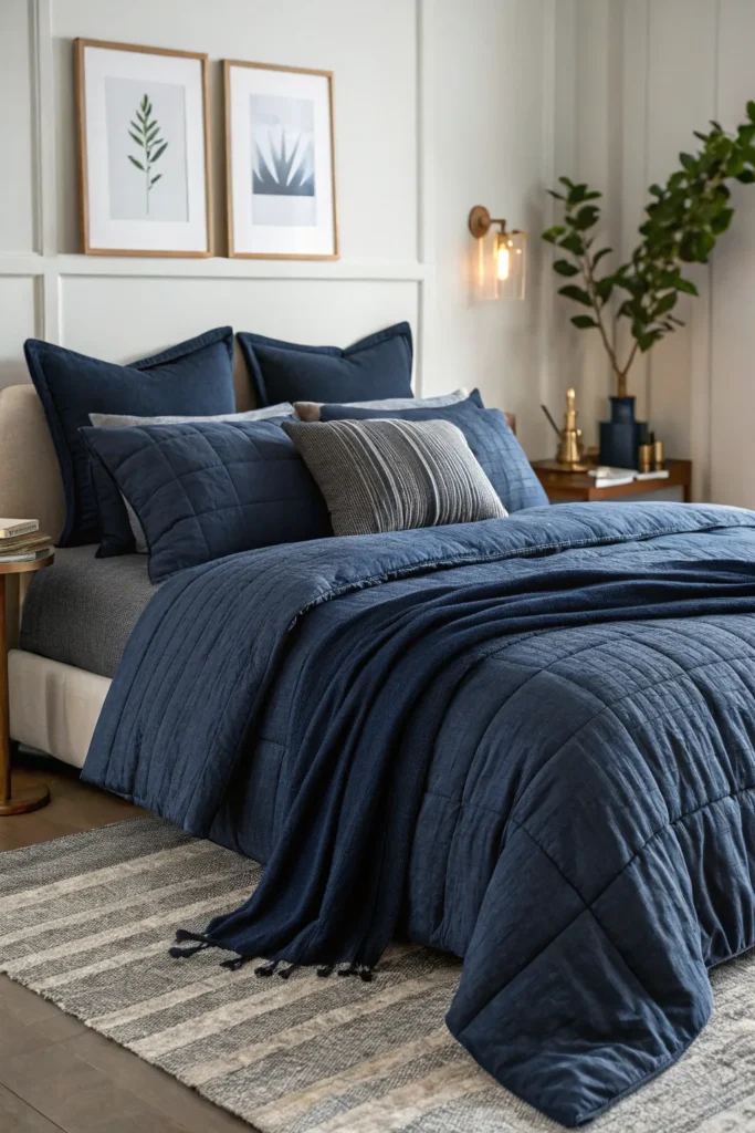 If you want a softer introduction to dark blue, focus on bedding. Layer different shades of blue—navy, indigo, and slate—through duvets, throws, and pillows. This approach feels modern because it relies on tonal layering rather than bold contrasts. It also allows you to update the look seasonally without repainting.