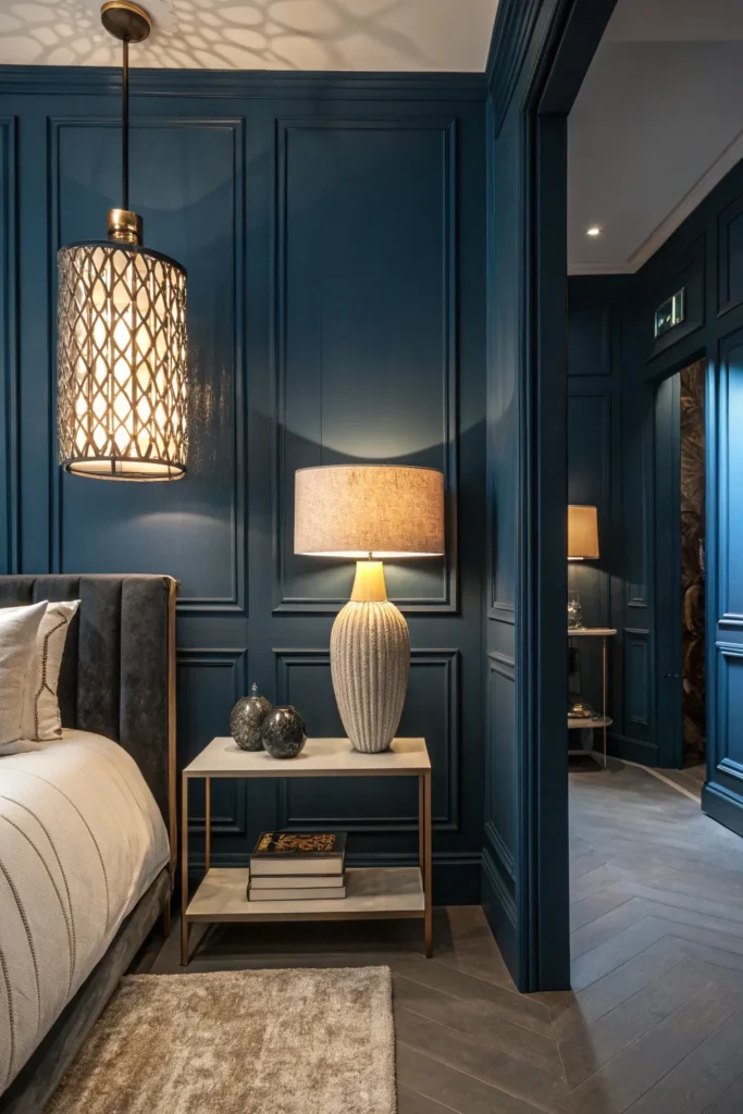 Lighting plays a crucial role in making dark blue bedrooms feel modern rather than gloomy. Statement pendant lights, sculptural table lamps, or integrated LED lighting can transform the space. Warm light temperatures work best, as they soften the blue and create a cozy atmosphere. Modern lighting designs also add visual interest without clutter.