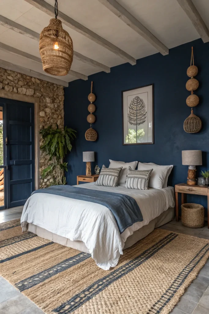 Bringing natural elements into a dark blue bedroom keeps the space grounded and current. Think linen bedding, woven rugs, stone décor, or indoor plants. These materials contrast beautifully with dark blue and reflect today’s emphasis on organic, calming interiors. The result is a bedroom that feels both modern and deeply relaxing.