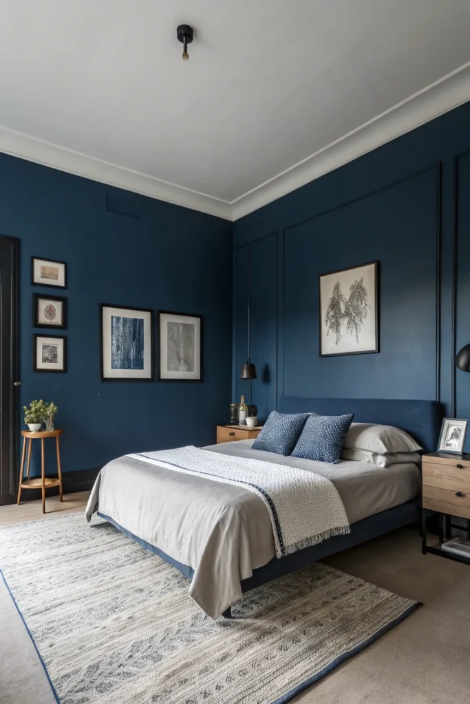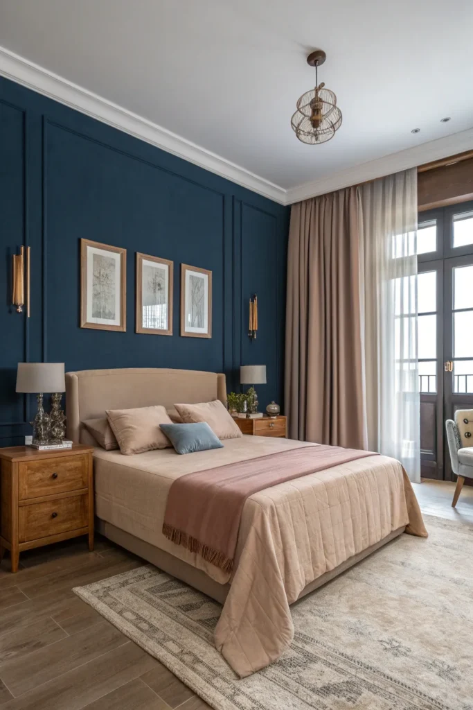 A dark blue accent wall is one of the easiest ways to introduce this color into a bedroom. In modern interiors, this works especially well behind the bed, acting as a visual anchor for the room. Pair the wall with crisp white bedding, warm wood furniture, and minimal décor to keep the space clean and contemporary. Matte finishes are especially popular today, as they absorb light softly and add richness without glare.